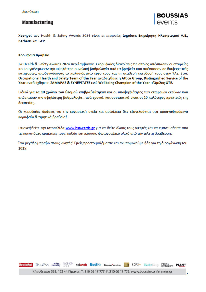 The aim of the Health & Safety Awards 2024, organized for the 10th consecutive year by BOUSSIAS Events under the auspices of the Hellenic Institute for Occupational Health and Safety, is to showcase companies that create and maintain safe workplaces, cultivate a culture of preventive health and safety among employers and employees, and serve as role models within their respective industries.