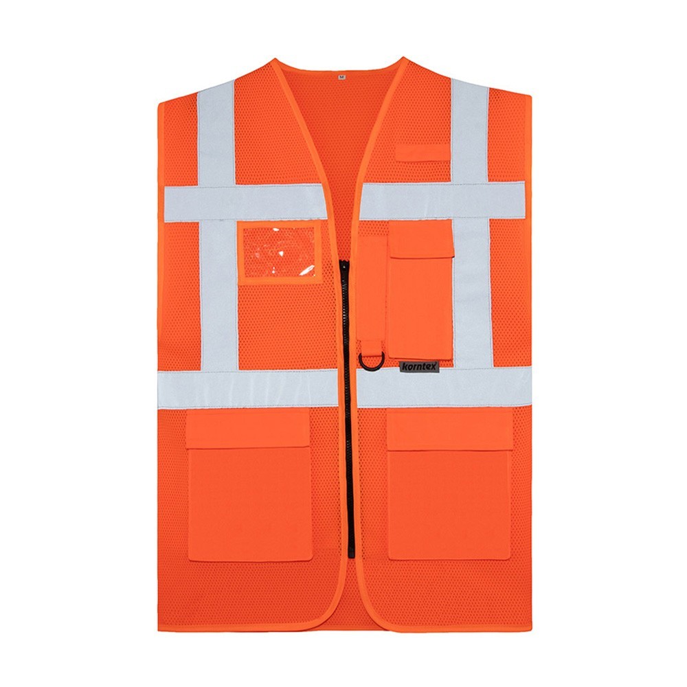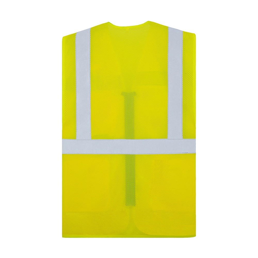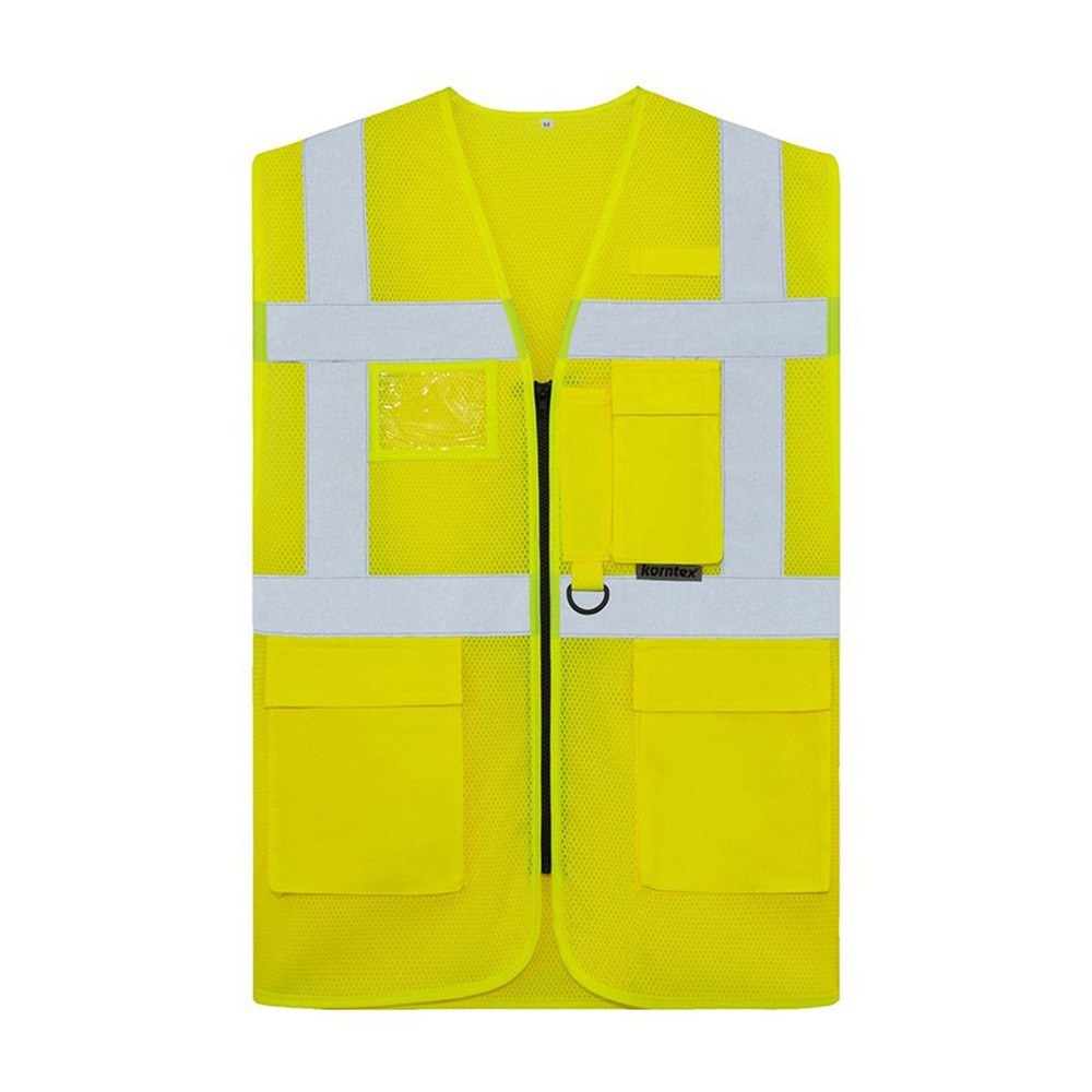 Διχτυωτό πολυλειτουργικό γιλέκο με ανακλαστικές ταινίες, πολλαπλές τσέπες και κρίκο D, πιστοποιημένο κατά EN ISO 20471.