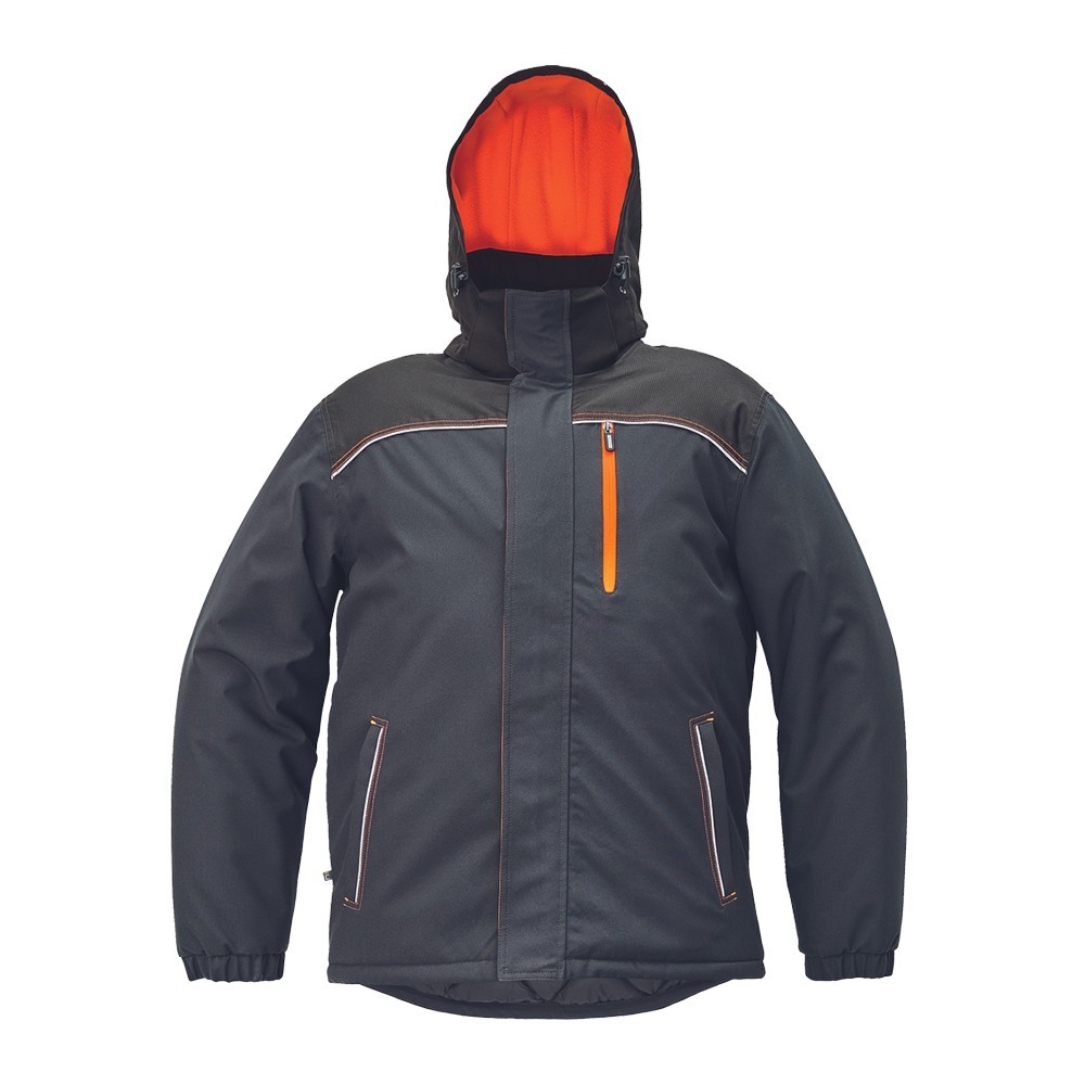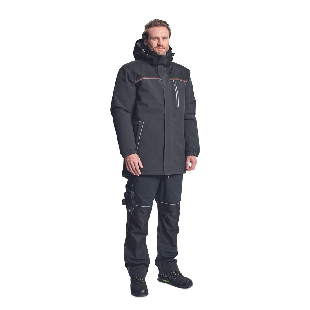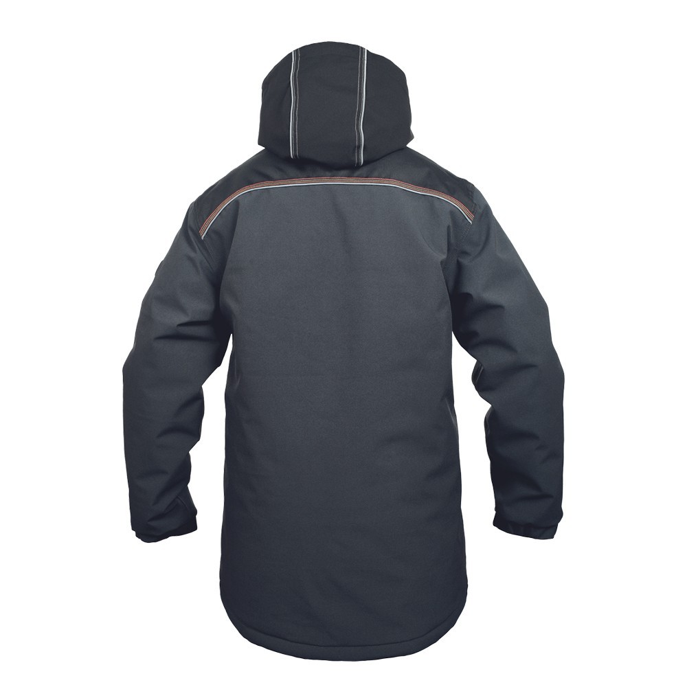 Ανδρικό χειμερινό μπουφάν εργασίας με εσωτερική επένδυση και αποσπώμενη κουκούλα. Διαθέτει TPU μεμβράνη που προσφέρει αντοχή στην υγρασία και ενισχύσεις από ύφασμα OXFORD 600D στους ώμους για αυξημένη αντοχή. Με εκτεταμένη πλάτη, ανακλαστικές λεπτομέρειες, διακοσμητικές ραφές και είσοδο για κέντημα ή τύπωμα. Πρακτικές τσέπες: 1 στο στήθος, 2 πλαϊνές, 2 εσωτερικές με κλείσιμο. Ρυθμιζόμενο στρίφωμα με κορδόνι για καλύτερη εφαρμογή.